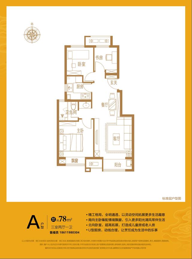 户型点评:先来看看项目的主力户型78平的全明三居,首先80以下的户型做成三居的还是很少见的,而且三居的功能性要比两居强上很多。最为难得是,项目在78平做三居的基础上,还做到了南北通透+全明格局,舒适度上还是非常不错的。而且客厅还配有独立的封闭阳台设计,未来晾衣服的地方也有了,功能性也很强。对于小户型需求的朋友来说,这个户型还是非常适合上车的。