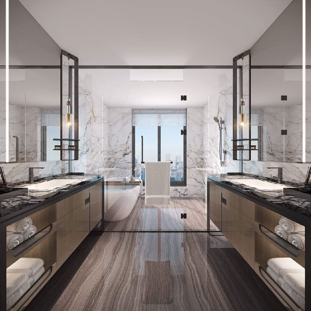 4、即便是使用功能,也要进一步的细分,不仅是分行为“大类”,而是分大类行为中的“小类”。这个在主卧的功能排布上表现得非常典型。在主卧的卫生间内,世茂北京天誉的设计团队采用的是“四分法”,而不是传统的“两分法”。即在传统的“干湿分离”的基础上,将马桶区和洗漱区分开,同时,再将淋浴和泡浴分开,从而在功能上划分得更加细致,居住和使用更加有舒适性。