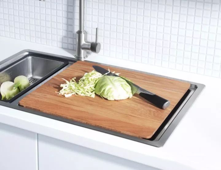 也是较常见的一种方式,这种水槽更好清洁,台面的水可以直接擦入水槽,下沉的凹槽也可以直接将案板卡住,更方便操作