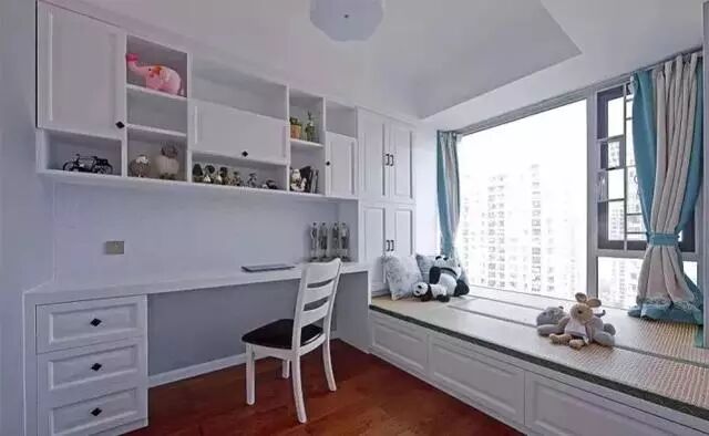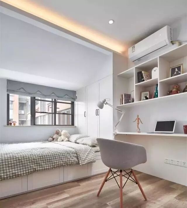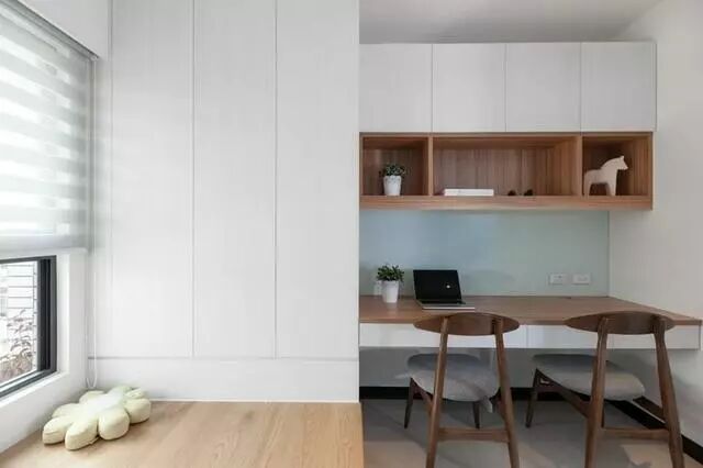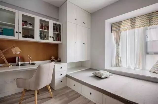 榻榻米间如果对衣柜没有重点需求,也可以将重点放在书柜展示柜和书桌的组合搭配上,丰富视觉效果和收纳的刚需。