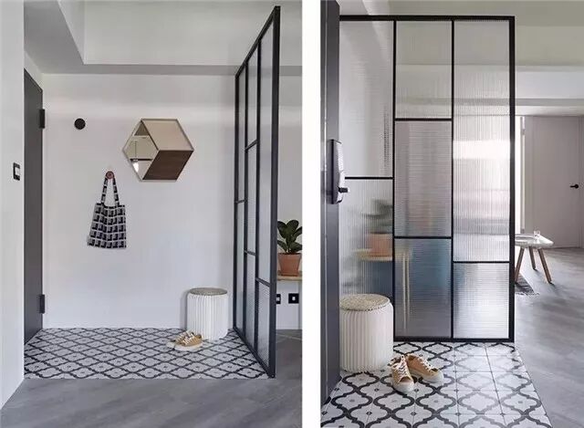 入户玄关地面选用黑白花砖与室内地面隔开,条纹磨砂玻璃隔断完全北欧小清新气质,不影响透光性,又能遮挡客厅区域独立自在。