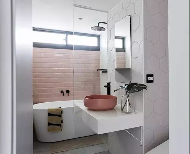 橘粉色系的卫生间,利用一面玻璃墙隔断做了干湿分离。台上盆设计非常可爱,让整个卫生间的气质提升不少。