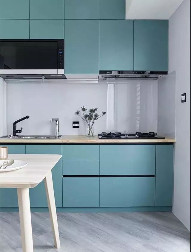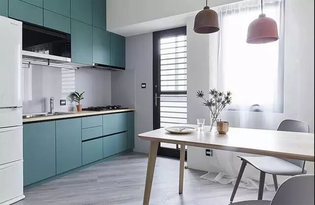 清爽又透着轻复古气质的厨房橱柜,与原木色餐桌椅搭配合宜。靠近小阳台,更可直达客厅和入户玄关,采光性优秀。