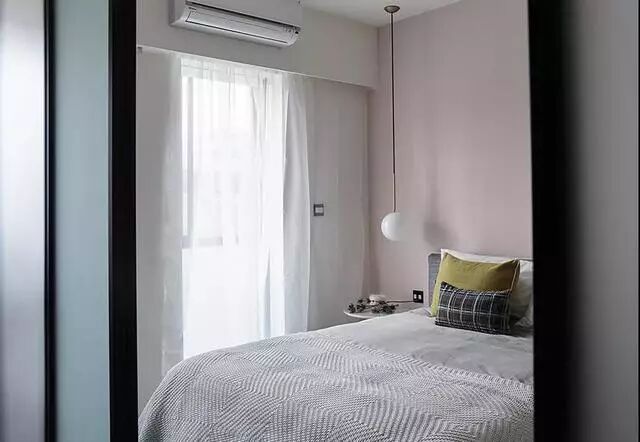 卧室墙面选择了更突出女性柔美的灰粉色,相比嫩粉等更明亮的色彩饱和度较低,搭配灰色系床品和白色系家具都很合适。