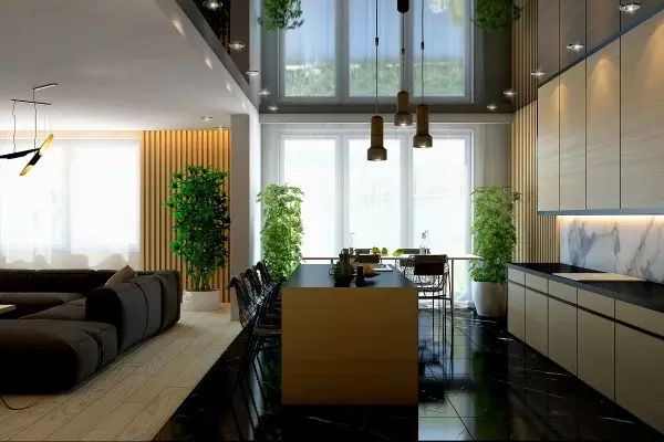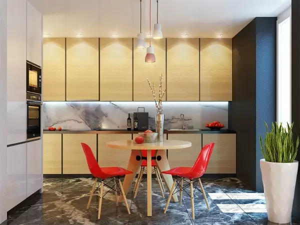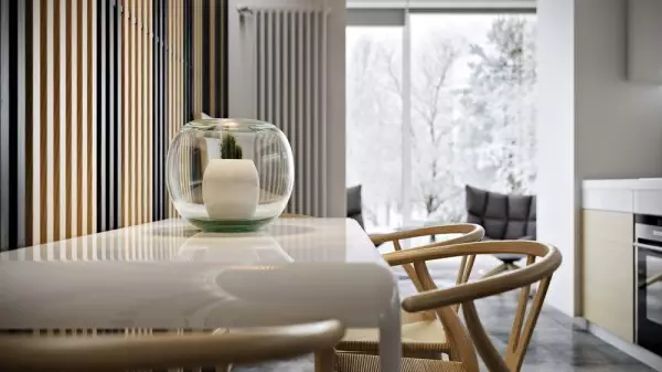 如果说第一个空间板条设计让空间更加微妙,那么第二个空间橱柜、椅子和桌子的木材使用让空间更加丰满。