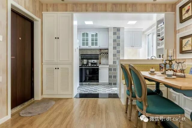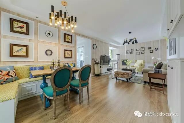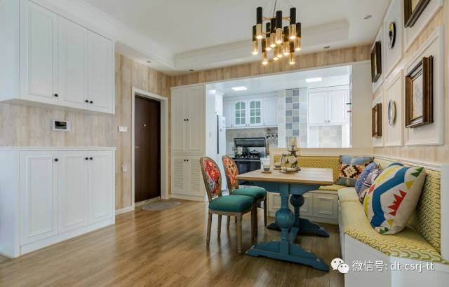 餐厅设计了卡座不仅好看,座位做成抽屉式,增加了储物空间。餐厅背景墙挂了几幅工艺画,增加了艺术氛围。