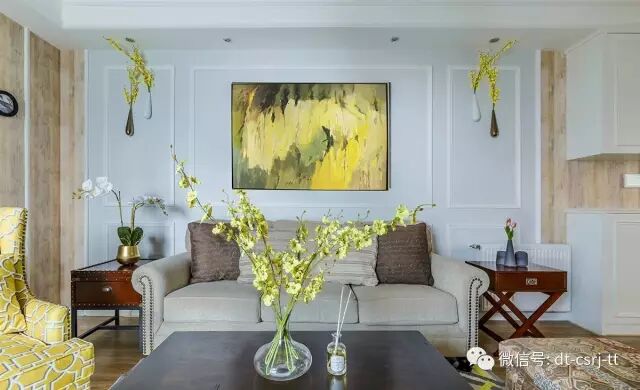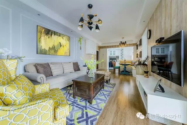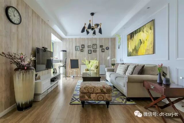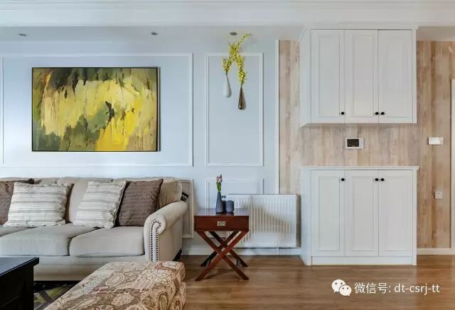 沙发背景墙用乳胶漆调了个颜色,用混油木质线条做了简单的背景墙造型,电视背景墙和地面用了相近色,颜色的差距会使电视墙和沙发墙的距离变宽。