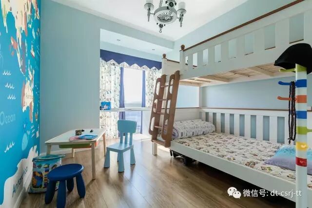儿童房,设计了高低床,一个矮桌几把椅子,平时可以和孩子在这里读儿歌画画。