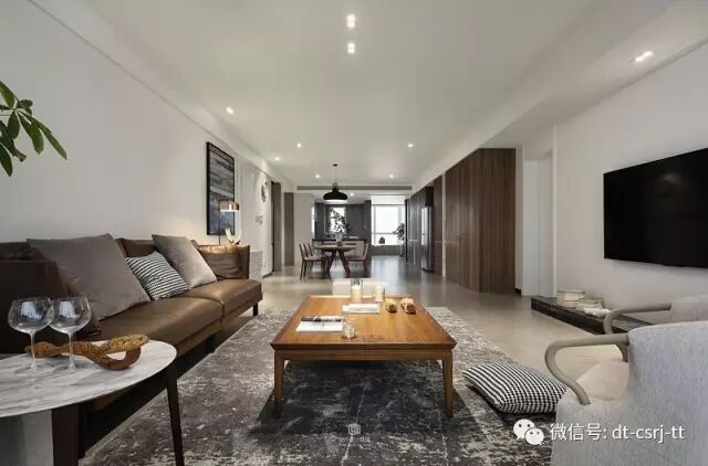 极简的装修,没有背景墙和,电视柜用大理石台子替代,一个简单的原木色书柜,几张沙发。