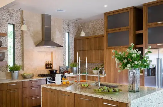 厨房装修材料除了应防水防火以外,操作台面选择放射性低的也非常重要。有研究显示,浅色花岗岩,如白色、红色、绿色等,比深色花岗岩的辐射更强。若青睐天然石材的话,大理石是不错的选择。