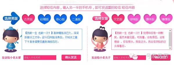 在线为心爱之人许下承诺,内容分男版女版,男版细分为古言版、闷骚版、二逼版、恶心版;女版细分为文艺版 、琼瑶版、煽情版 、嬛体版,选择版本,并输入另一半的手机号,即可发送爱的短信。