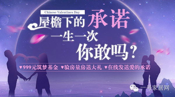 还在用老土的方法庆祝情人节?别了吧,一点都不浪漫。在这甜蜜的日子,就让一号家居网充当爱之鹊桥,为爱传达心意。在7月28日至8月8日活动期间,在线即可为心爱的TA发送爱的承诺,更有999元筑梦基金,与子偕老方可使用,一生一次,你敢接受这样的挑战吗?