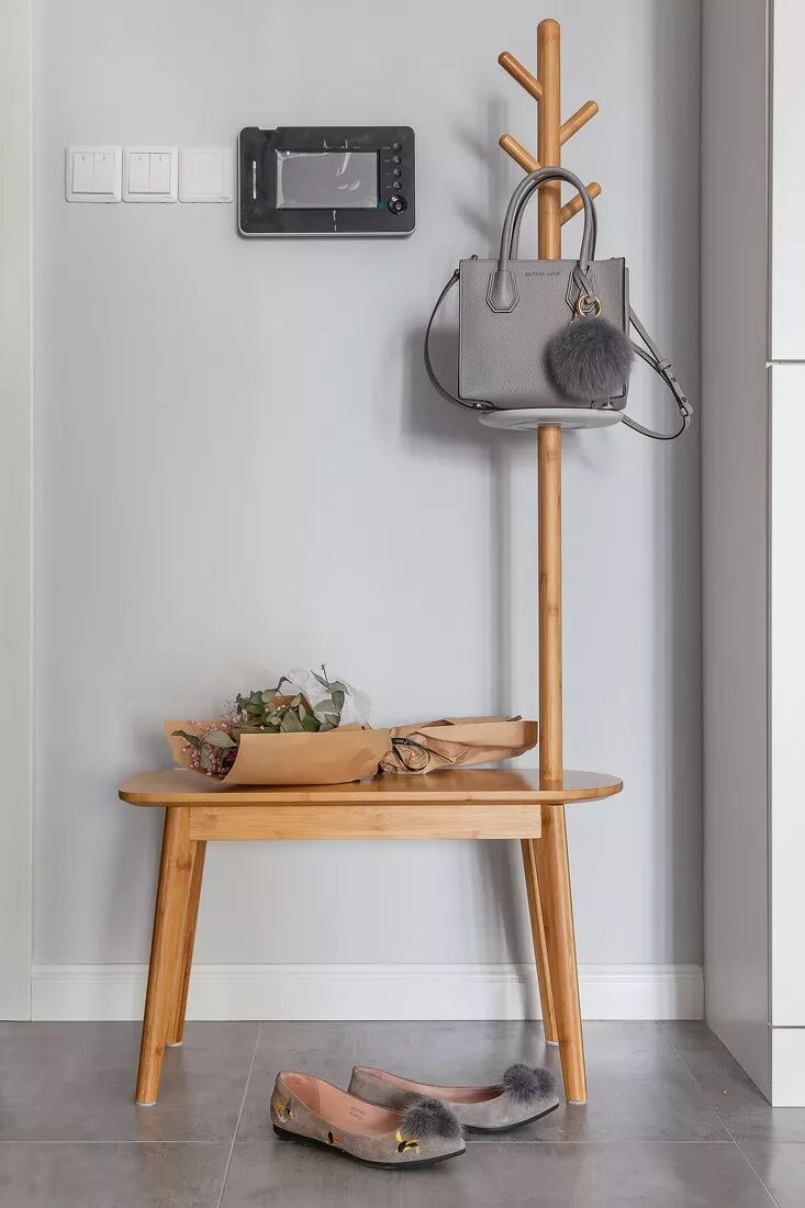玄关换鞋凳+衣架一体的设计十分有趣,节省空间的同时,也增添了别致的美感。