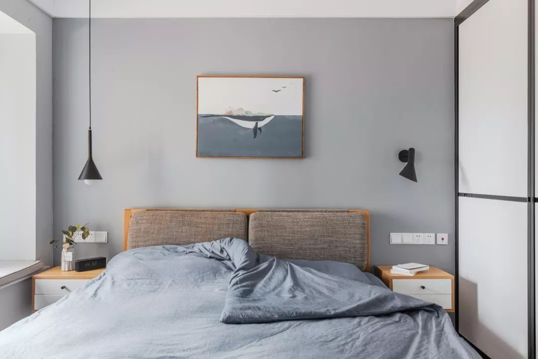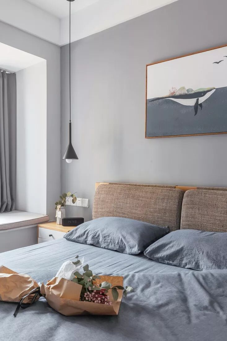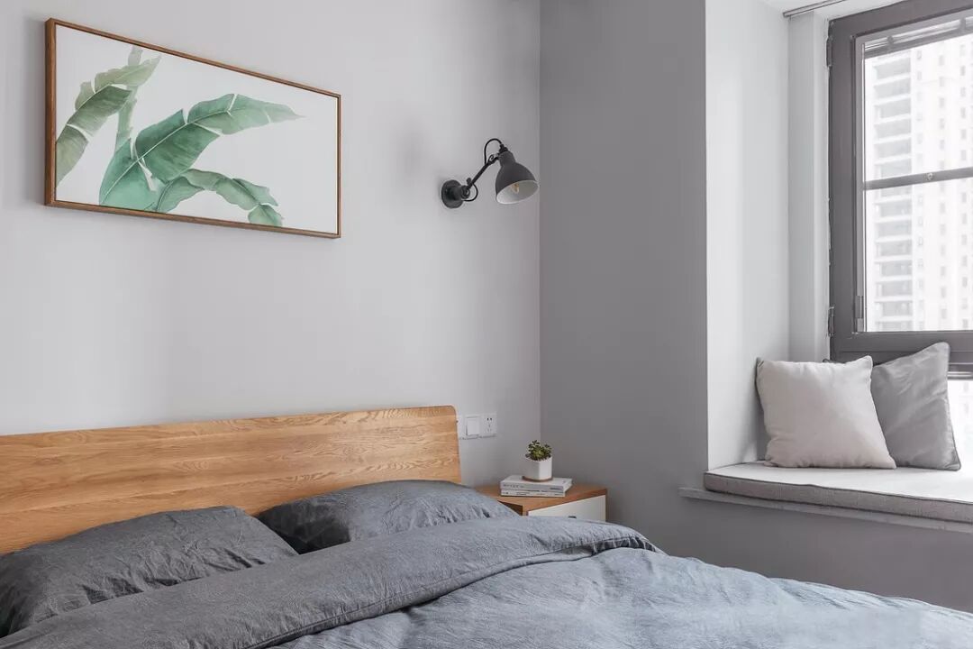 次卧延续主卧的风格,床头绿植装饰画清新又亮眼。