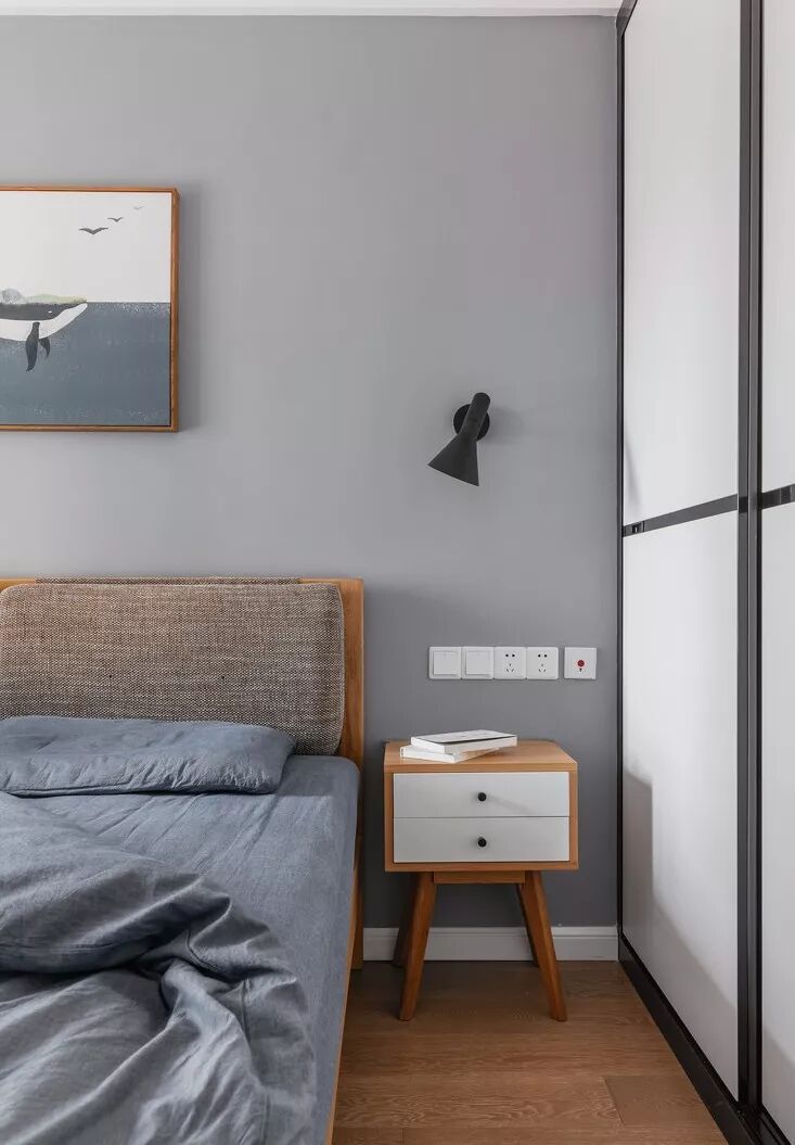 木质在这一片灰度中勾勒自然的味道,增添些许暖意。衣柜推拉门的设计与小巧的床头柜互不冲突,节省了使用空间。