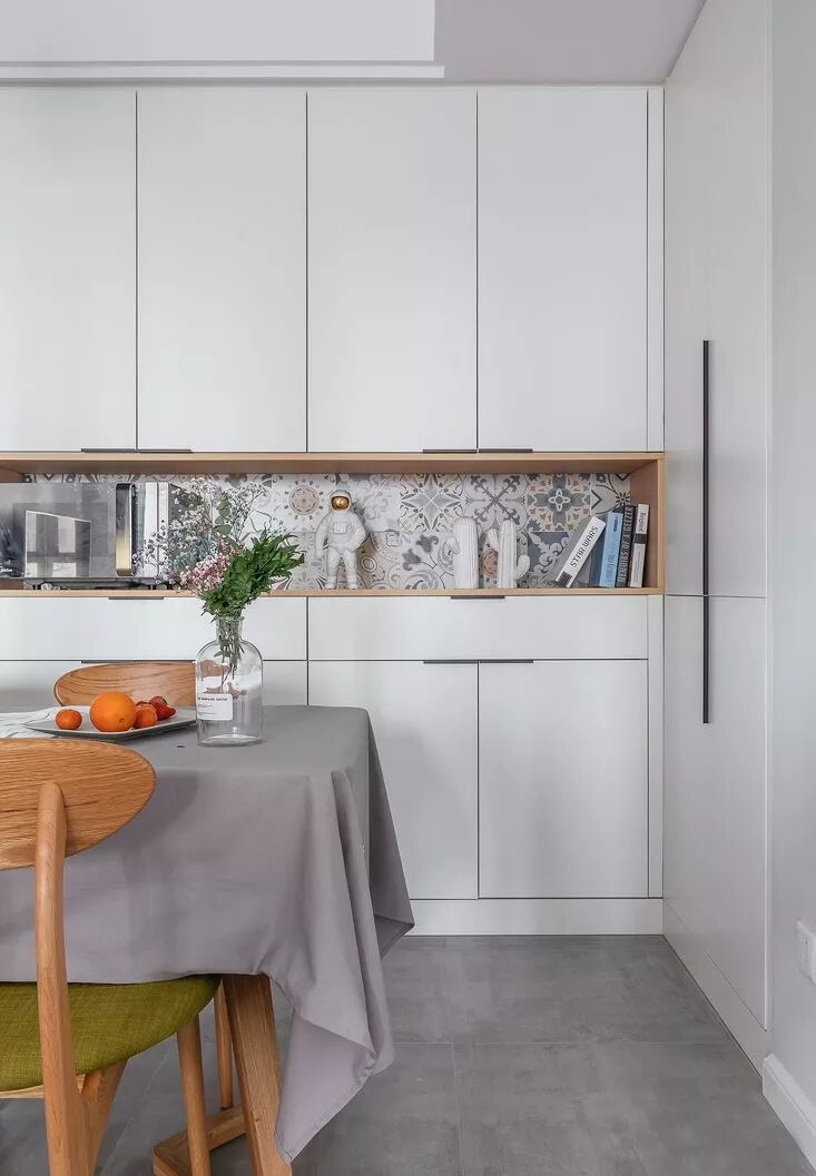 一面墙的柜子,为餐厅空间提供了强大的储物功能。中部留空用精致的小花砖作为背景,装点上自己的收藏品,成为了空间十分亮眼的所在。
