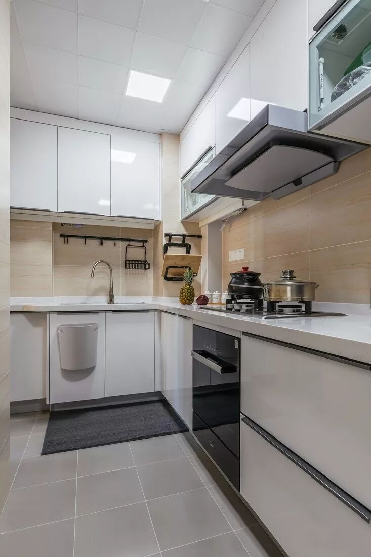 厨房白色的橱柜干净利落,L型的布局让每一寸空间都充分利用。