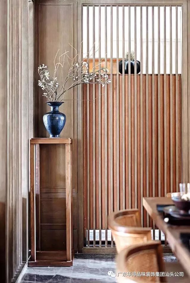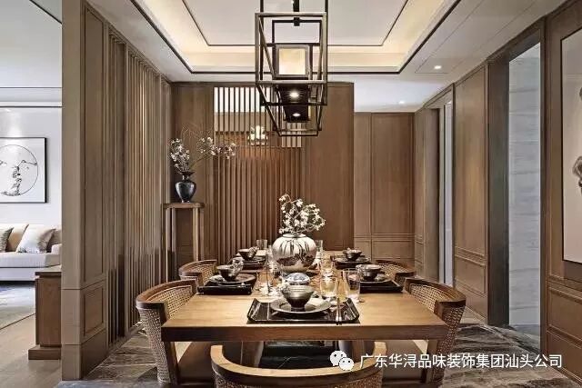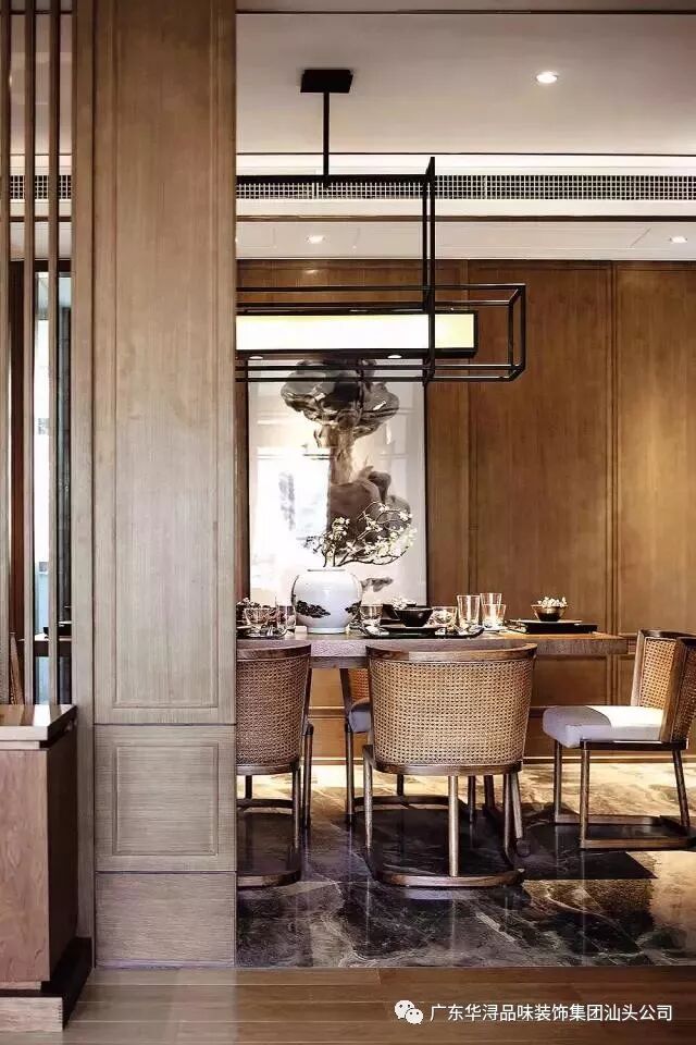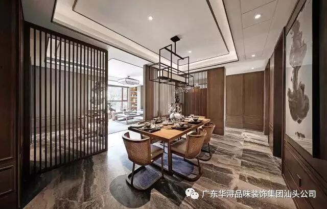 客厅与餐厅空间用竖向木格栅隔断隐约划分,丰富了空间层次,又充满浓郁的古典情调。餐厅空间首先引入眼帘的是富有框架线条美的透光云石吊灯,对应暖色系楸木餐桌椅,使用餐空间更加独立。
