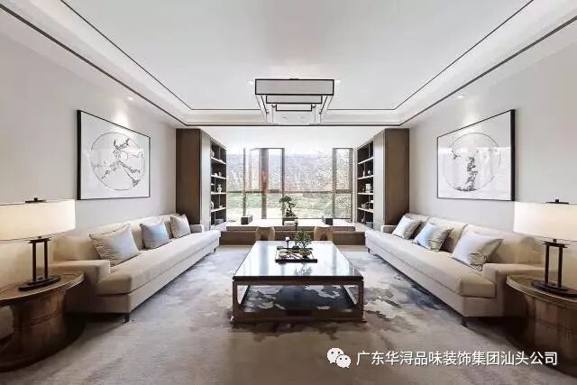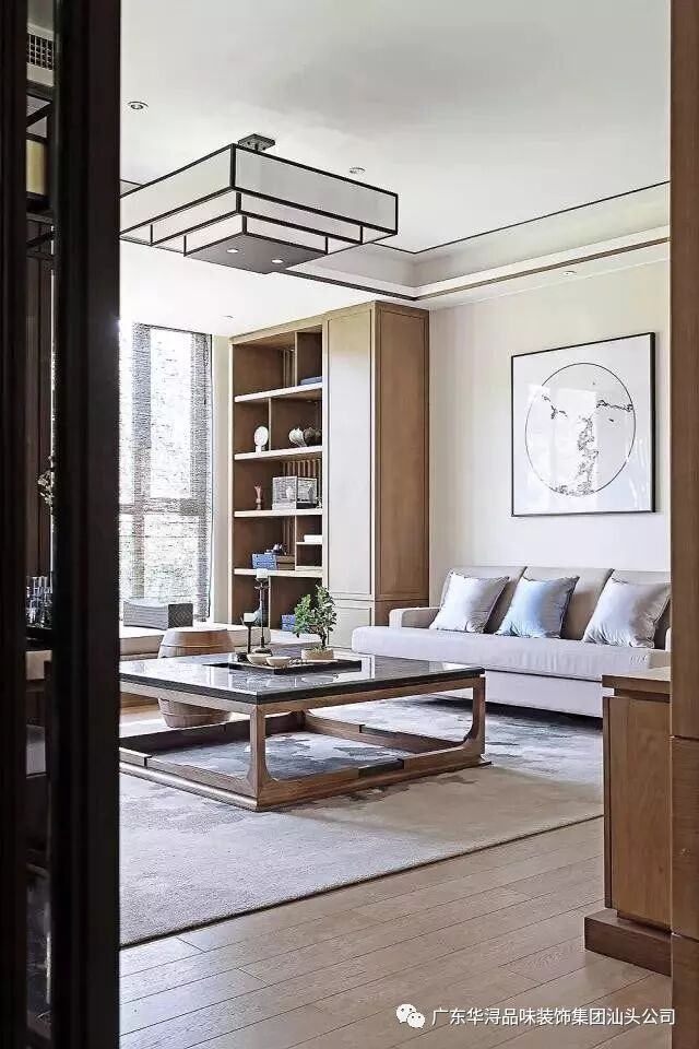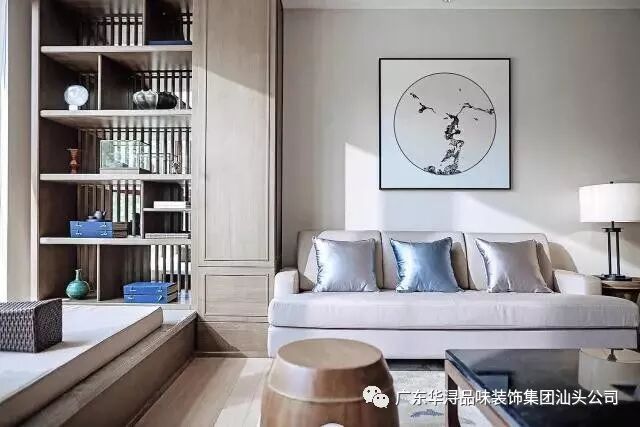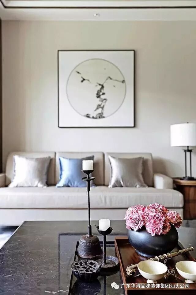 客厅陈列稳重简约的中国式家具,搭配现代布艺沙发,造景以山水屏风、陶瓶盆景、灯笼状的灯具,将禅风在新中式空间里演绎。