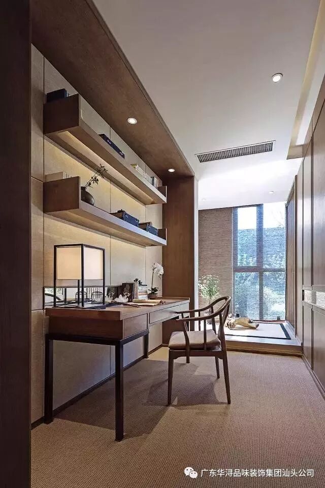 量身定制的衣帽间用木格栅推拉门连接,开合间制造惊喜。书房连通茶室,亚麻色布艺硬包搭配简洁明快的胡桃木索色哑光漆书桌椅,阳光洒下,沏一盏清茶,阅一卷好书,推开门,便身处与繁杂都市不同的世界。