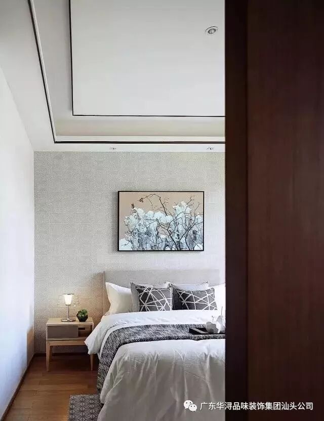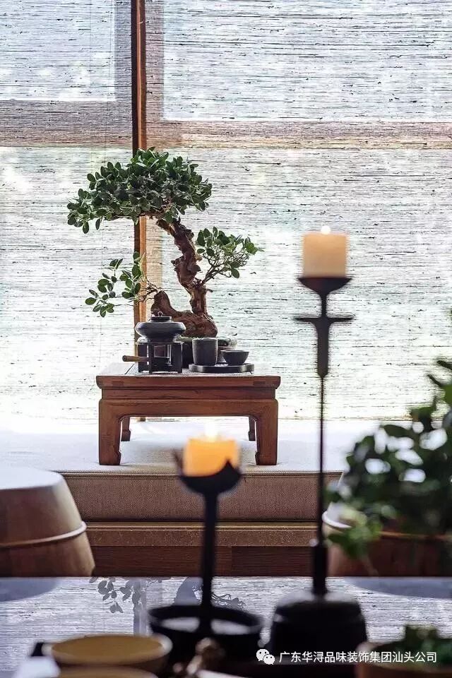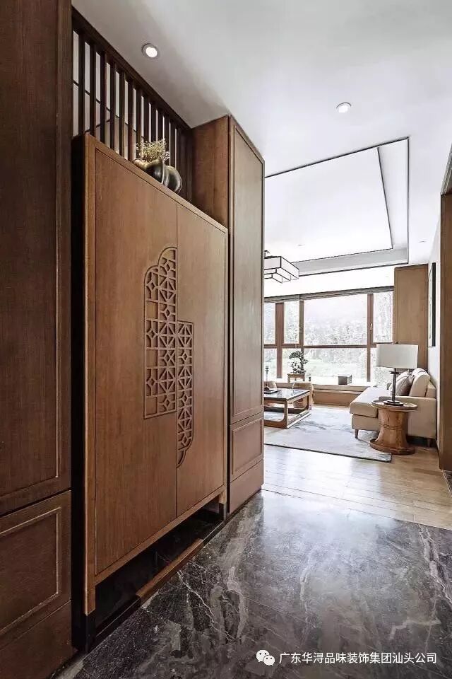 玄关贯穿餐厅与客厅空间,巧妙而让空间具有隐蔽性。硬装选用大面积的橡木饰面、真丝布艺硬包、仿宋代山水壁纸等物料。