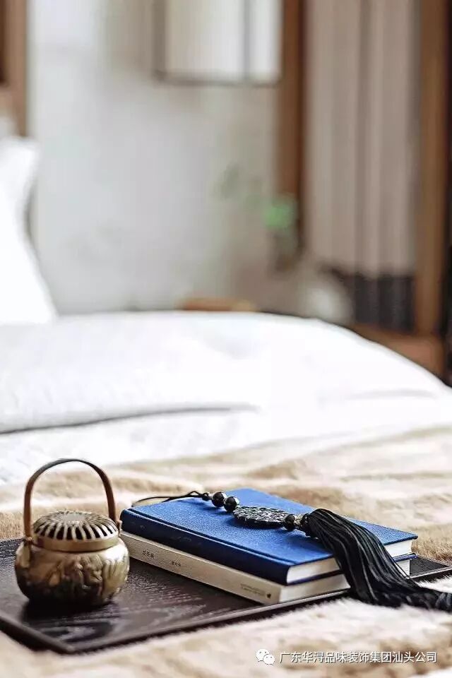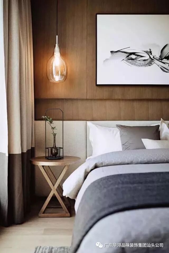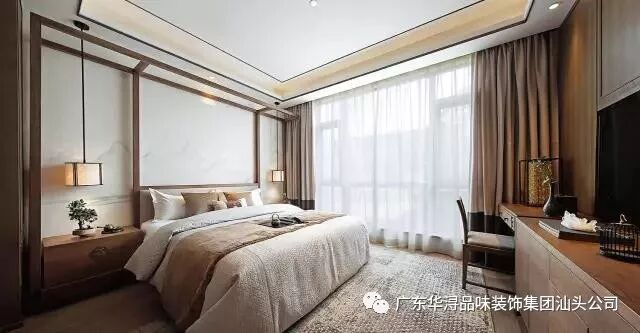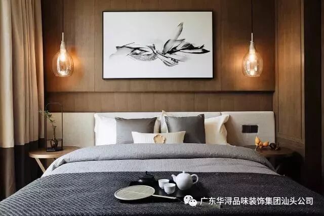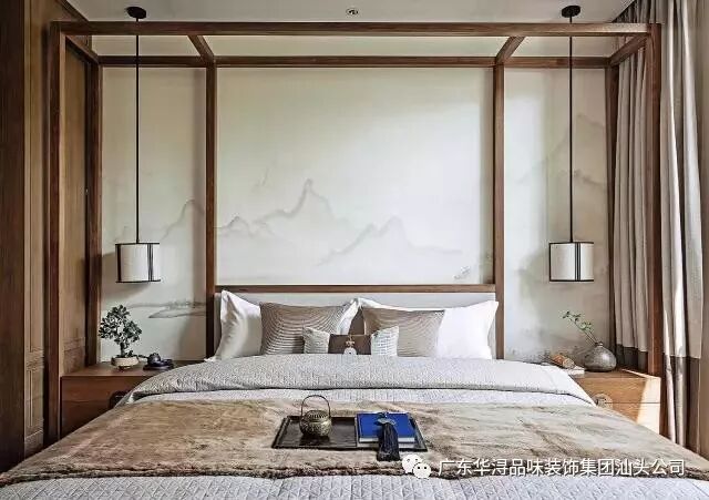 走过画廊式的过道步入主人房,映入眼帘的背景墙以对称均衡的构图方式呈现在空间中,一幅订做的手绘山水壁画仿佛在讲述着一个关于古时优美故事,垂吊在两边的灯笼吊灯营造温暖的格调。