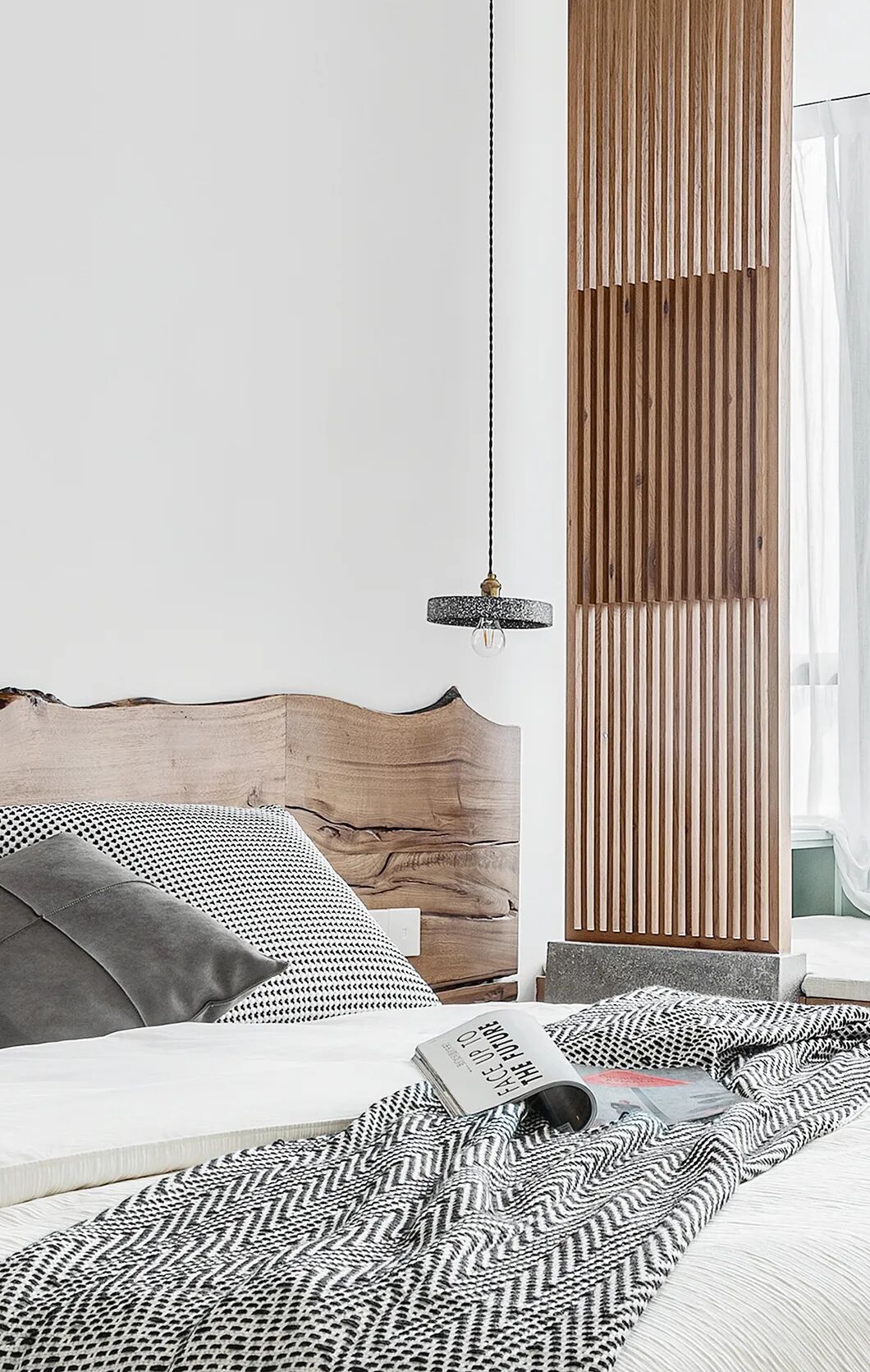 床头两侧的格栅屏风,既划分了区域,又借着光影让空间多了些灵动感。窝在飘窗台上,尽情享受惬意的时光。