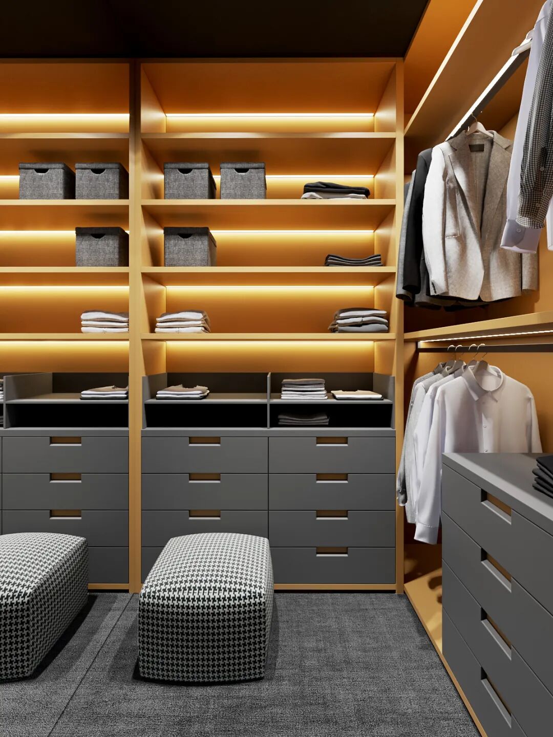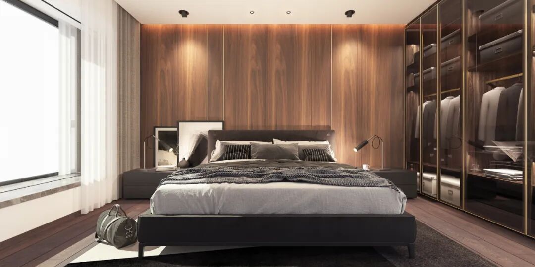 局部照明是建议在衣柜里装一些暗藏的LED灯带或线条灯,增强在衣柜内取物方便,局部灯光设计能有效提高空间品质感。另外可以选择一些可调角度的灯具,在使用过程中调整方向,直接可对柜内暗区进行照明。