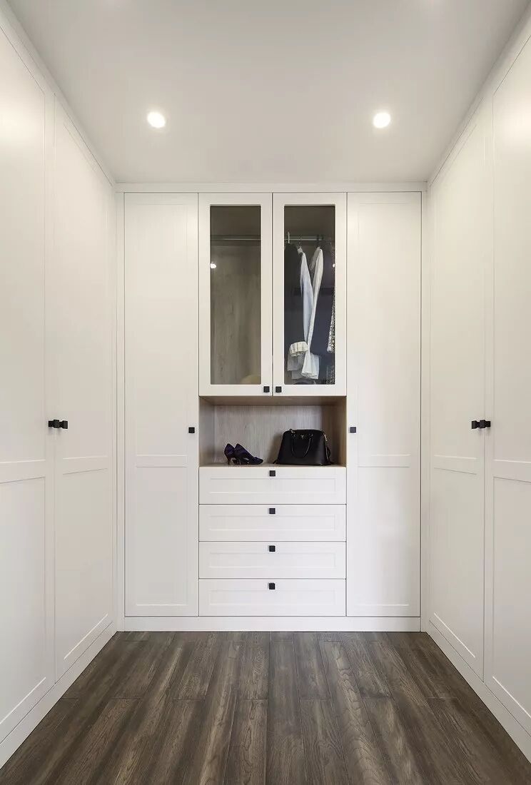 在足够宽的狭长形的空间,衣帽间可以设计成平行而立的二字型,不仅可以最大化地利用空间,还可以保证空间的通透性,中间的过道正好可以空出窗户的位置,让家里的自然光更加充足,使得空间给人带来明媚愉悦的心理感受。