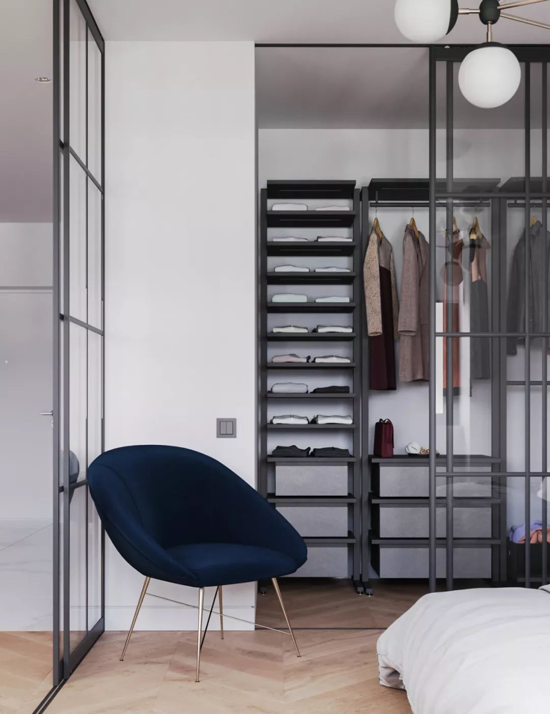除此之外,开放式衣帽间较为省地儿,而且由于衣柜没有柜门,可以一目了然,拿取衣物比较方便,但是没有柜门衣服很容易就会落灰,所以可以选用玻璃的推拉门或者平开门,纱帘或者布帘也是不错的个性选择。