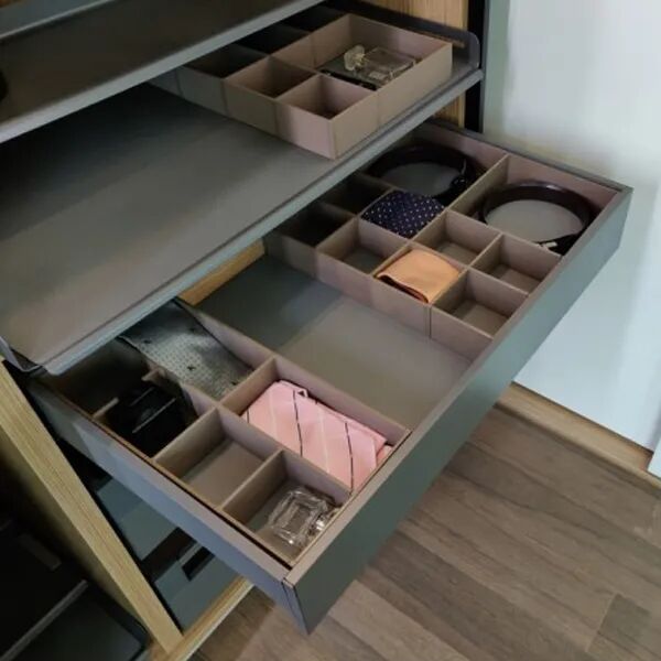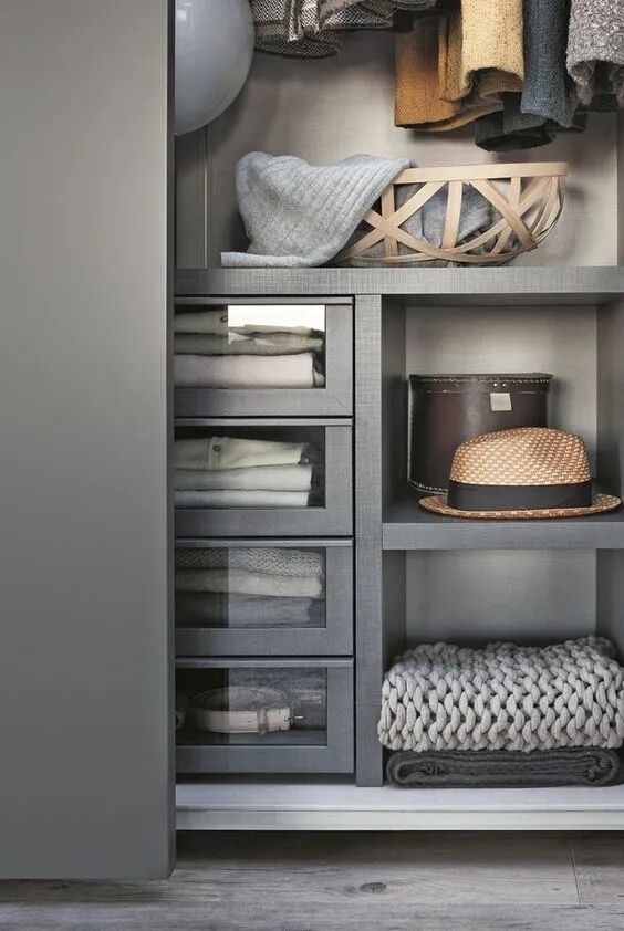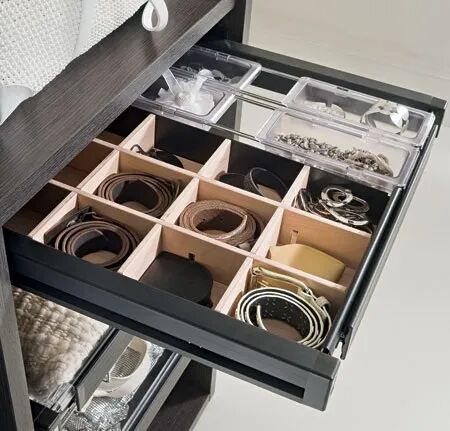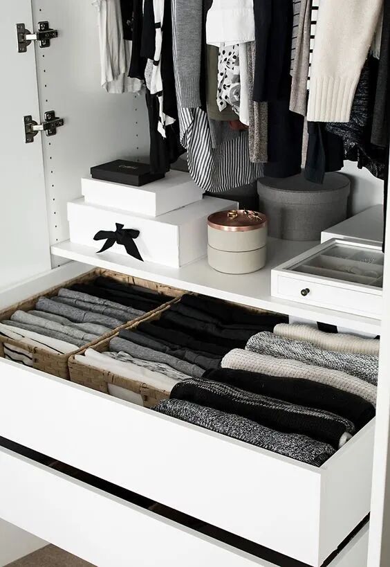 普通抽屉可以通过增加小储物盒的方式改造成下图,空间利用率更高,适合存放服装配饰/小物件和不容易产生褶皱的毛绒织物等。