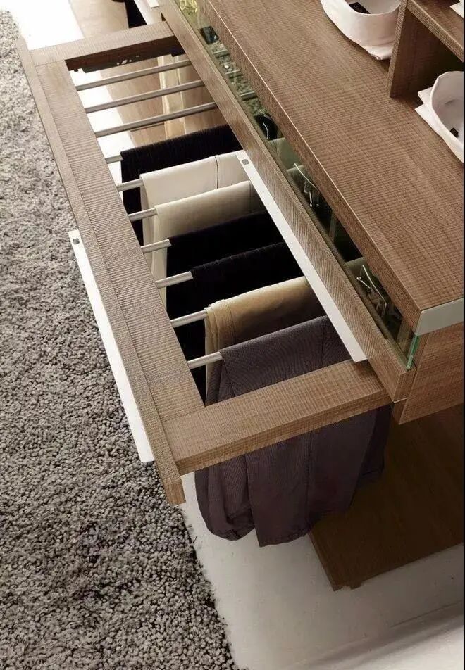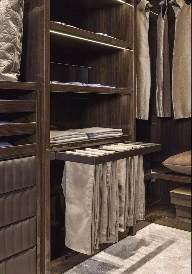 不含挂裤架的衣帽间,也可如下图购置一些相应的配件,来达到类似的效果。