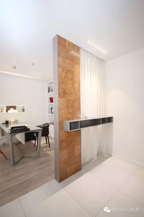 进门的隔断,实木截面的图案采取阵列方式的排序让简单的材质通过简单的表现方式显得更自然、时尚,并提升了整个空间的厚重感。拖地的白色纱帘使整个造型增加了一丝柔意。意大利原版设计款的沙发,意大利原版设计、工艺的真皮沙发