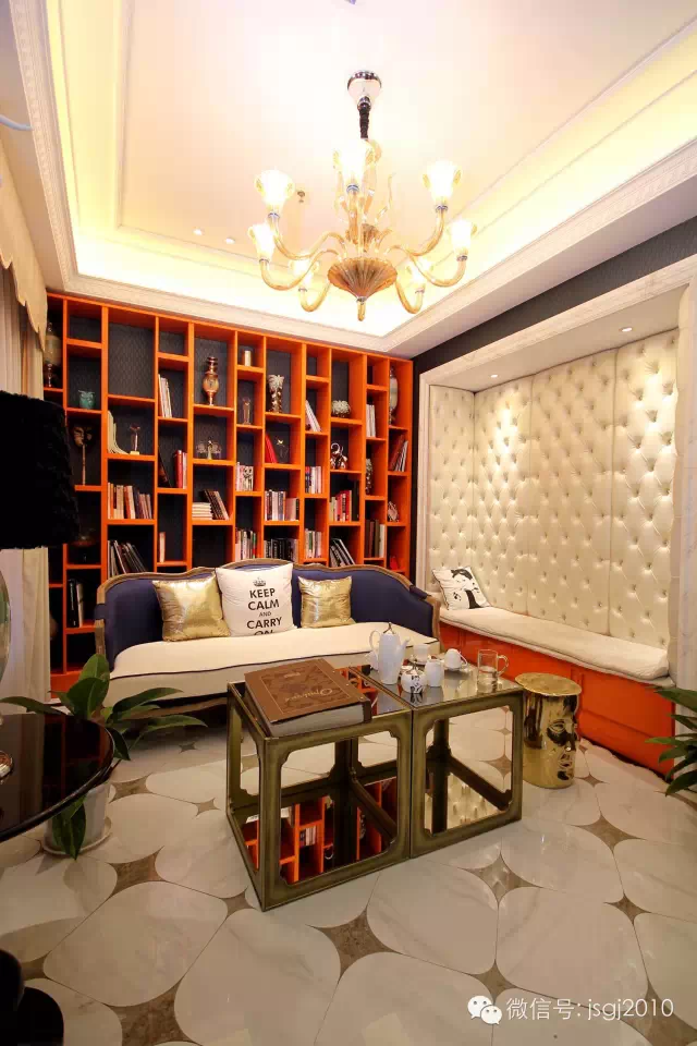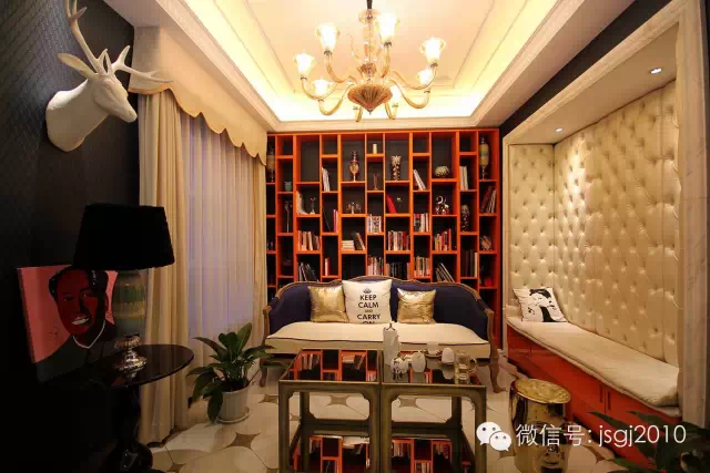 整个空间的亮点在于色彩的搭配:墙面普蓝色的网格状壁纸与造型错落的橙黄色书架在色彩上相互碰撞,产生强烈的视觉冲击力,让整个空间显得非常精致,同时也流露出一种时尚复古的文艺范。
