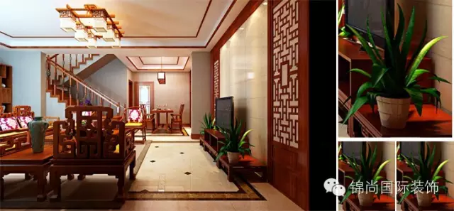 在中国风的整个设计中加入绿色植物元素,可以为整个设计增加悠然的味道,另外,家里摆放适当的植物,可以增加家里的活跃气息。