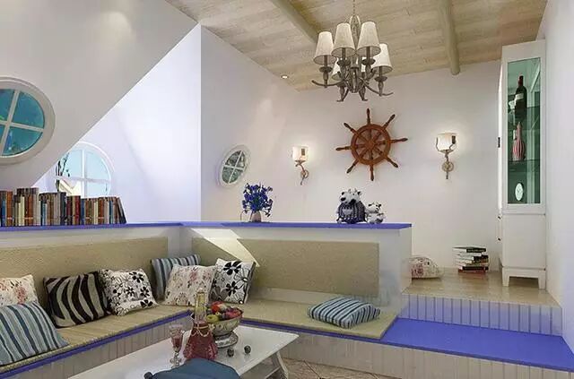 ▲床的前端装上柜子,不仅具有缩小空间占用,还具有强大收纳功能。蓝白地中海色彩相间,颇具有异域风情。