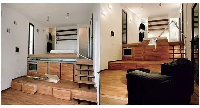 ▲较小的空间中加入榻榻米,是最明智的选择。实木地板切出弧面,做成阶梯状,不仅实用,而且颇具艺术。