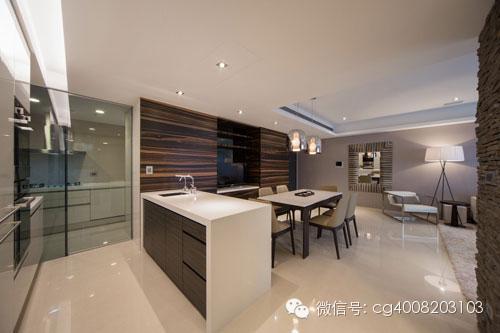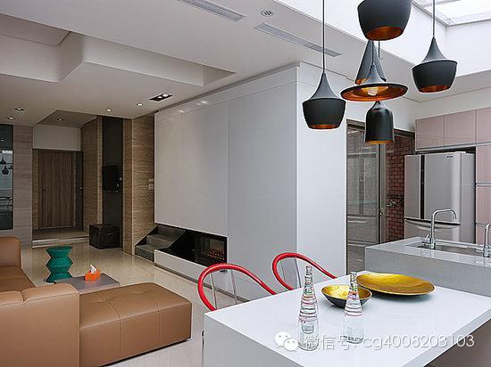 编辑点评:抓住现代风格表现,每日皆须开火的厨房采用强化玻璃拉门作为空间隔断,能有效阻绝油烟散逸。