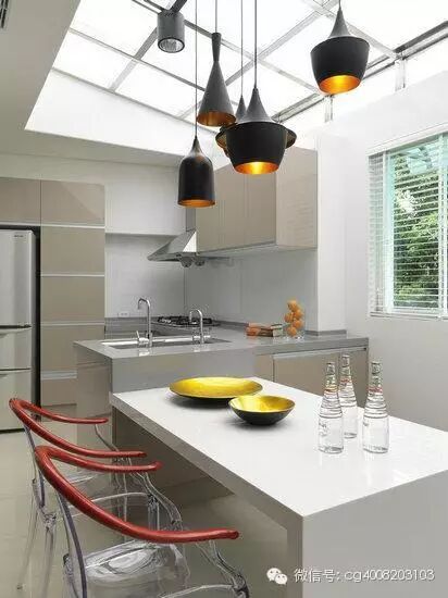 编辑点评:在独立台面上方安置吊顶,不仅固定住悬空的抽油烟机,也留出一些摆放厨房瓶瓶罐罐的空间。