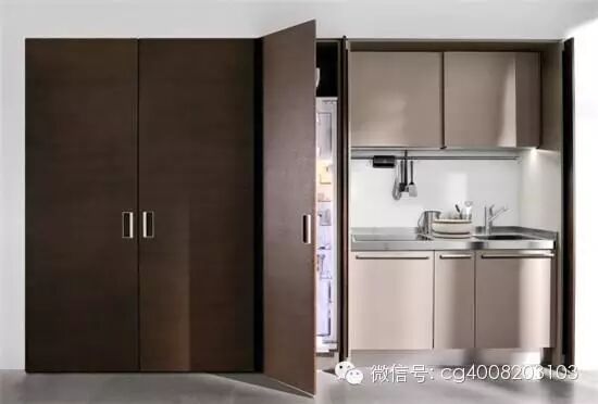 编辑点评:将冰箱箱独立隐藏在一个凹进门背后,方便开启。