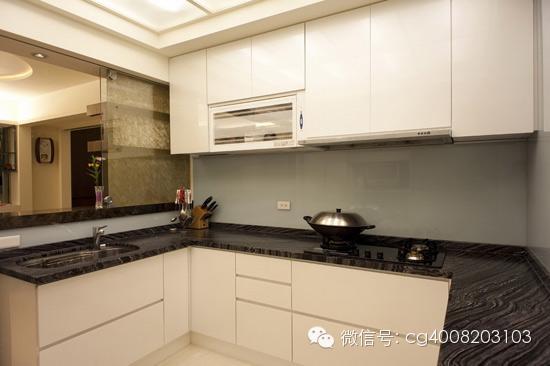 编辑点评:该厨房是典型的L型开放式空间,因省去了吧台而显得特别开阔和干净整洁。利用墙体间隔打造出两个独立的内嵌收纳空间,提升了厨房的收纳能力。