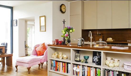 编辑点评:把吧台远离烹饪区的一侧打造成敞开式的收纳柜,放上各种烹饪书籍和精美的工艺品打造成厨房的阅读空间,既防止了油烟污水弄脏弄湿书籍也美化了厨房空间,提升了整体格调。