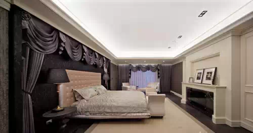 用地台充当床架省去了床头柜的设置,简单美观又节省成本,其内部还被打造成多个收纳柜,充分地利用了空间。高床背设计提升了大床的立体感。