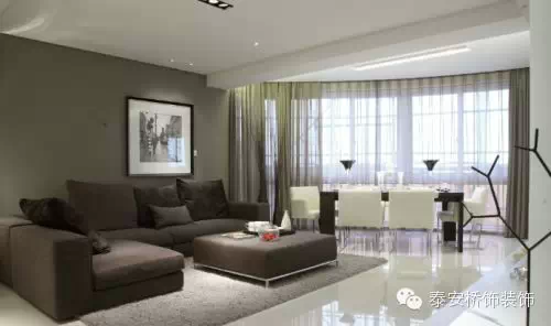 棕色的客厅整体居室设计,客厅和餐厅之间没有选择很明显的隔断,但是客厅却选用了简洁巧妙的颜色以及顶部隔断,让我们感觉整个居室的布局清晰,而且美观、简洁。