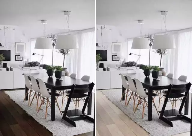 正如下图,地板颜色的深浅不同,整个空间的感觉很不一样吧。