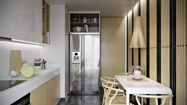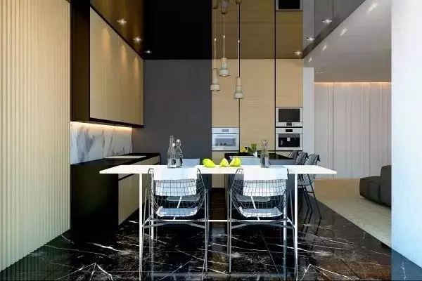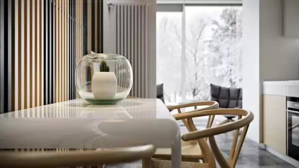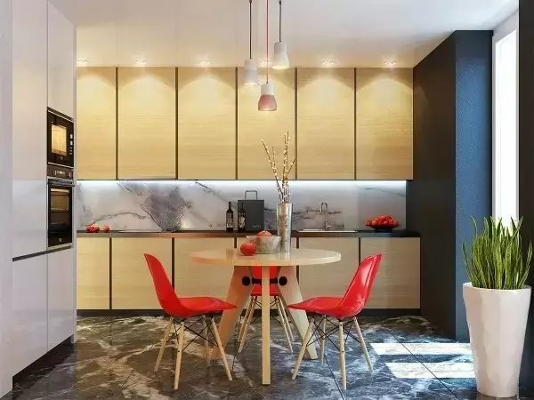 同样是出自设计师 Eugene Anfilova 之手,如果说第一个空间板条设计让空间更加微妙,那么第二个空间橱柜、椅子和桌子的木材使用让空间更加丰满。