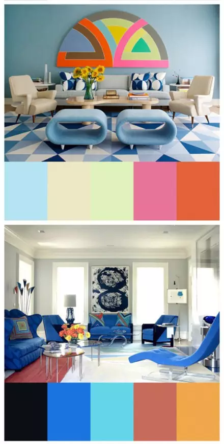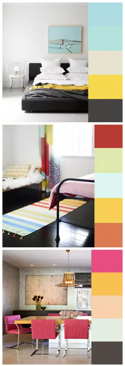 多种颜色的搭配下一定要选好主色调,然后大面积的使用,就不会显得房间凌乱,例如上图的蓝色、黄色、粉色的沙发一样。