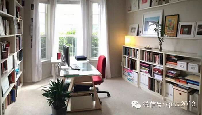 目测是个客厅或主卧大小的空间,作为工作室使用,空间规划颇有看点:左侧通顶的书柜,写字台放中间,写字台后方沿墙摆放一排矮柜,矮柜上方是搁板照片墙,大量使用纸盒收纳零碎物品。还有一个要点:全白空间,家具、地毯、窗帘、搁板……整个空间简洁明朗。