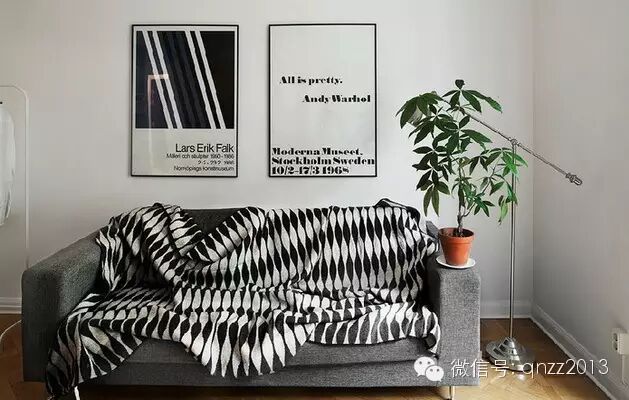 白墙,灰沙发,黑白几何盖毯,植物,落地灯,黑白装饰画。搭配简单而有范儿,实现很容易,你也可以轻松做到。