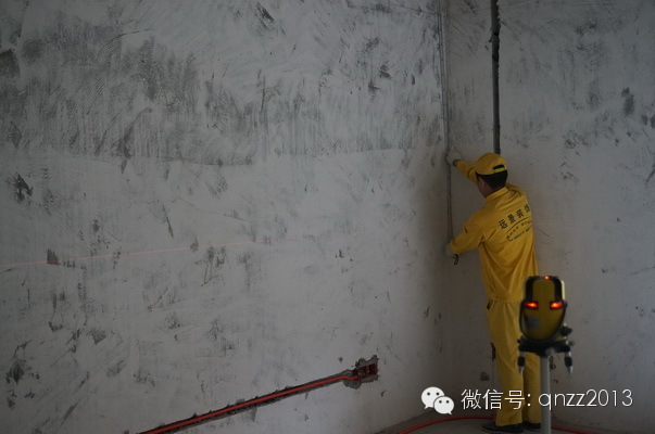 工程师傅正在细致地用红外线水平仪精确地丈量。